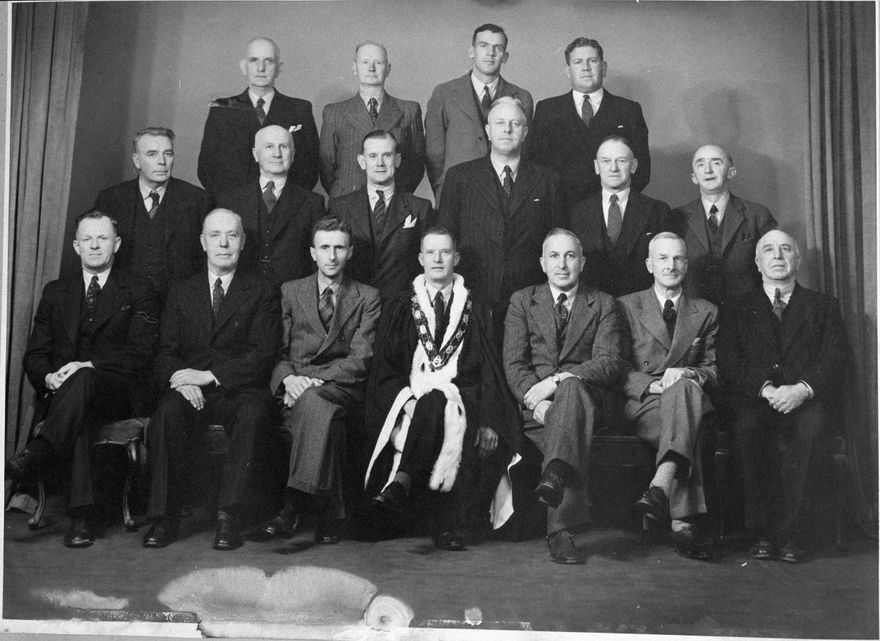 From left. Back row: J Learmonth - Gas Manager; J R Hughes - City Engineer; P Hall - Town Clerk; D MacKenzie - Curator. Centre: D Niven - Electrical Engineer; J R Hardie - Town Clerk; Cr G Grossley; Cr G C Peterson; Cr R Moxon; H Greenwood - City Librarian. Front Row: Cr J H Jensen; Cr C L Mowlem; Cr F Opie; G Tremaine - Mayor; Cr T P Hart; Cr K G Chamberlain; J R Hardie - Town Clerk.
