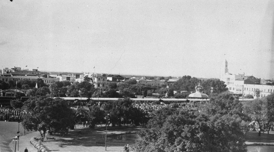Queen Elizabeth II and Prince Philip visited Palmerston North as part of their New Zealand tour. Here the train stops in The Square. Note the crown decoration on top of the Band Rotunda.