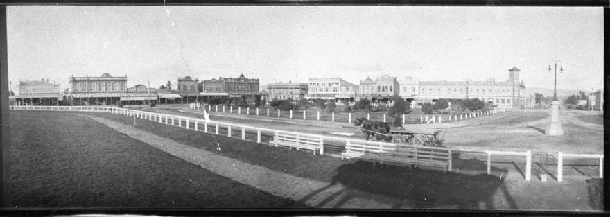 Panoramic view taken from close to the railway line in the centre of The Square, Palmerston North, with Main Street East on the left, the Church Street East corner at centre and Fitzherbert Street (now Avenue) on the right. The photograph was taken before the Te Awe Awe statue (built 1907) and the Millar and Giorgi shop was built in the Square (1902), dating it to sometime before 1902. Buildings include: The United Farmers Co-operative Association Ltd (second from left), established in 1895; the Club Hotel (the lower two-storey building on the other side of the Church Street corner); the second Occidental Hotel, with distinctive tower, on the corner of Fitzherbert Avenue. It was first built in 1887, was burnt down in September 1891 and was replaced by this similar building which was also destroyed by a fire in 1927.
