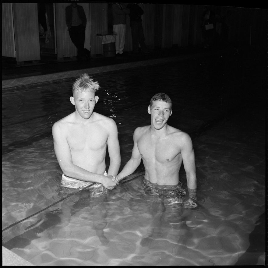This image was taken for a story that ran in The Manawatu Evening Standard on 17th January, 1963. "Having won the junior boys' 440 yards freestyle event, F. Bell (Manawatu) receives congratulations from S. Shirley (Wellington), left, who was placed second in the event".