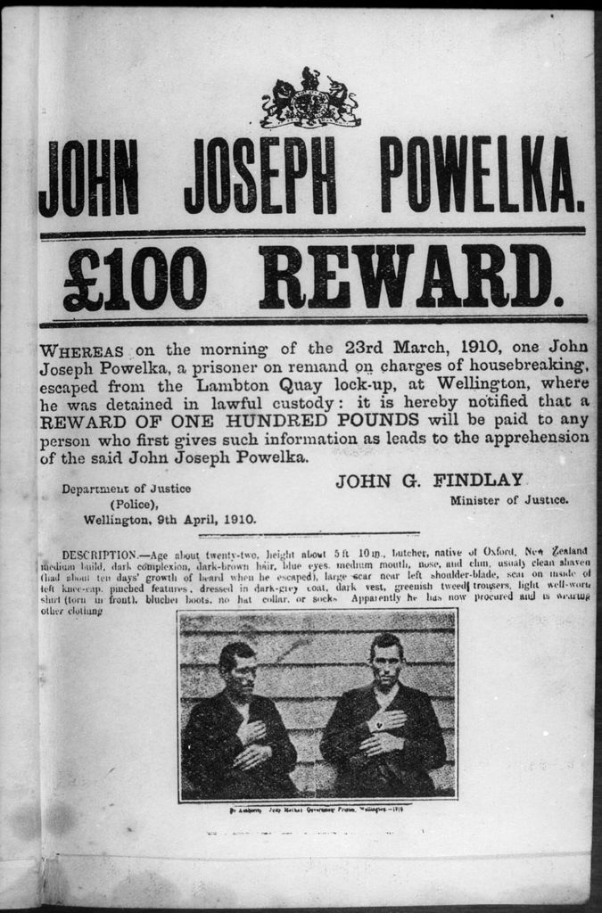 This is a image of the reward poster for Joseph Powelka (arrested in Ashhurst), an infamous prison escapee in 1910. Powelka’s suspected involvement in a series of robberies, burglaries and arsons led to a reward of £100.