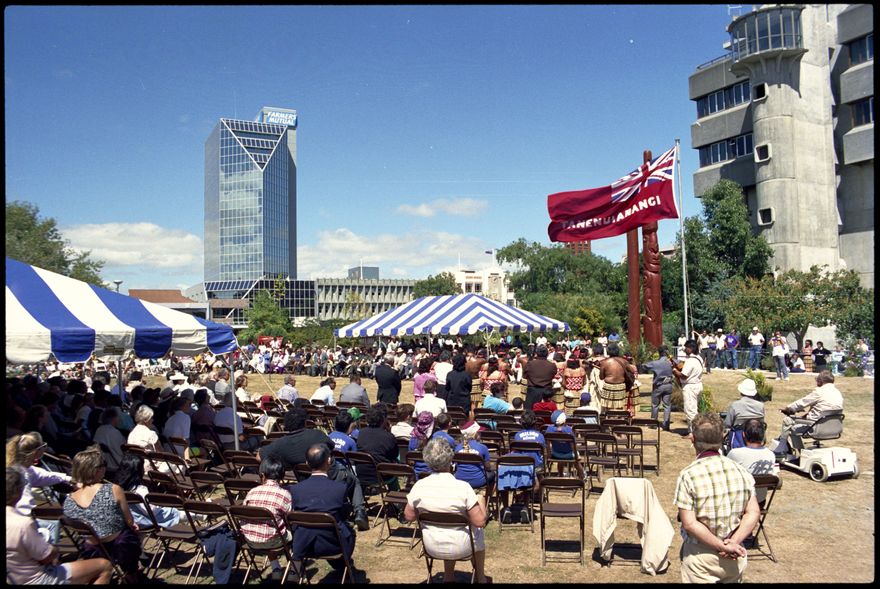 Images from the re-dedication of Te Marae o Hine on Saturday, 3 March, 1990. The following notes were written by City Archivist, Ian Matheson, around the time of the re-dedication. Background: Te Marae o Hine is that part of The Square on which stands the statue of Te Peeti Te Awe Awe and the City Council building. The name, The Courtyard of the Daughter of Peace was offered to Te Peeti Te Awe Awe one hundred and eleven years ago by Matene Te Whiwhi, Paramount Chief of Ngati Raukawa in memory of his ancestress, Rongorito, a famous peacemaker who lived in Waikato thirteen generations ago. Te Peeti Te Awe Awe received the name and offered it to the first Mayor of Palmerston North, George Snelson in the hope that there would be peace between all citizens of Palmerston North. 1990: The City of Palmerston North has commissioned a set of 9 great carvings to be placed in that part of The Square called Te Marae o Hine to form a gathering place for all people. The people of Rangitāne, tangata whenua of this area have imbued these taonga with their mana. They stand as a memorial to Rongorito and a tribute to the vision of Te Peeti Te Awe Awe, Matene Te Whiwhi and George Snelson.