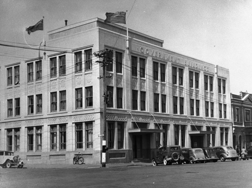 Originally known as 'Manawatu Buildings', this structure on the corner of George and Cuba Streets was erected in 1929 for Messrs. A. H. White, E. D. Berry and R. A. Port. The architect was C. Tilleard Natusch of Wellington. The three-storey building was constructed from reinforced concrete and featured marble-terrazzo floors and stairways. It originally housed the Dominion Sample Rooms on its first and second floors. On the ground floor, there were six shopfronts located on George Street and a further four on Cuba Street. In 1945 the NZ Government purchased the building and had it modified to house Government offices, including the Land and Income Tax Department and Social Security Office. It was subsequently known as 'Government Buildings'. The structure was demolished in 1992 to make way for a supermarket. It was later converted into a Harvey Normans store.