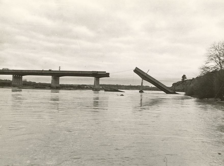This photograph shows the extent of the damage to the bridge caused by the collapse of two spans following scouring of the bridge foundations in a flood. The collapse occurred on the 15th of June 1973.