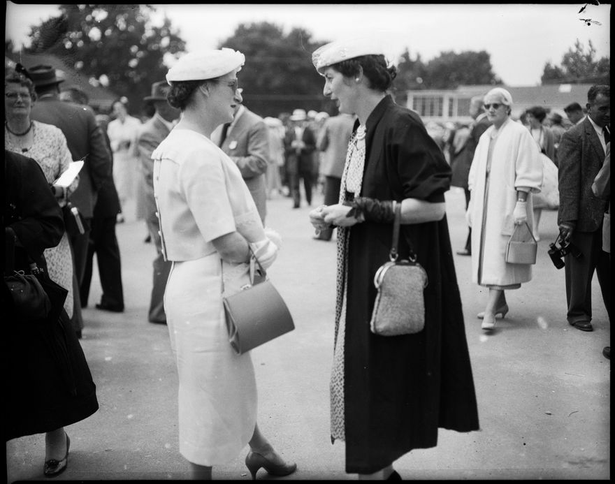This image was taken for a story that ran in The Manawatu Evening Standard on 22 December 1958: "On the first day of the Manawatu Racing Club's summer meeting at Awapuni on Saturday many were seen discussing the form of their fancied runners. These two women patrons were in deep conversation discussing a loss in the last race when this photograph was taken."