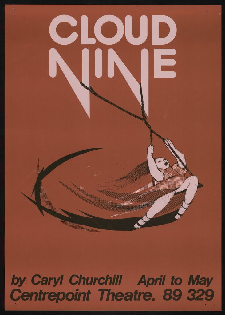 "Cloud Nine by Caryl Churchill. April to May. Centrepoint Theatre. 89 329." Part of a collection of posters that were displayed in the Public Library in the 1970s - 1980s.