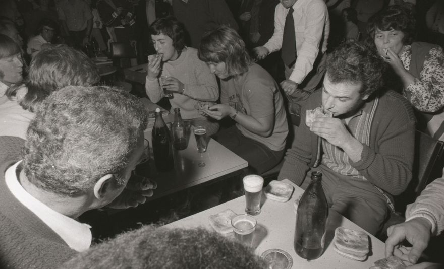 Members of the New Zealand Power Boats Association met in Palmerston North during the weekend of 17-18 May, 1975, for their annual conference and pie eating competition. The competition was held at a Palmerston North tavern, beginning at 2 pm. It took Manawatu boaties, Des Strong and Paul Godbas just 2 minutes 14 seconds to consume 8 pies specially baked for the occasion at a Palmerston North bakehouse. It was the second consecutive win for Manawatu, who took 4 mins 3 seconds to win in 1974. Taranaki boaties were second by a wide margin.Printed in the Manawatu Standard 19 May 1975.