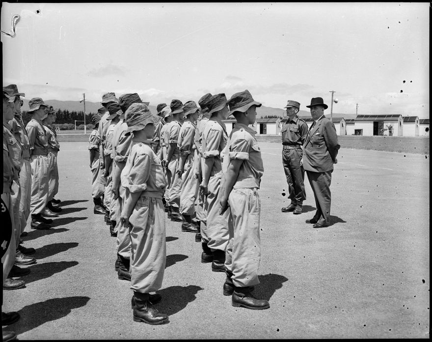 This image was taken for a story that ran in The Manawatu Evening Standard on 15 January, 1959. "The Minister of Defence (Mr Connolly) is here seen thanking High School n.c.o. cadets for curtailing their school holidays to undergo training at Linton Camp. He praised the boys for their sense of responsibility and leadership."Another photo associated with this article appears on the same day.