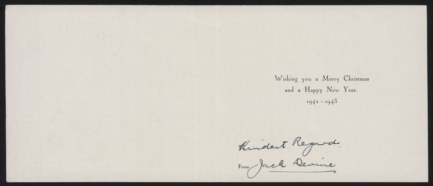 Christmas card from 2nd New Zealand Expeditionary Force, Middle East. The inscription reads: "Wishing you a Merry Christmas and a Happy New Year. 1942-1943. Kindest Regards. Jack Devine". The illustration on the front is by Peter McIntyre.