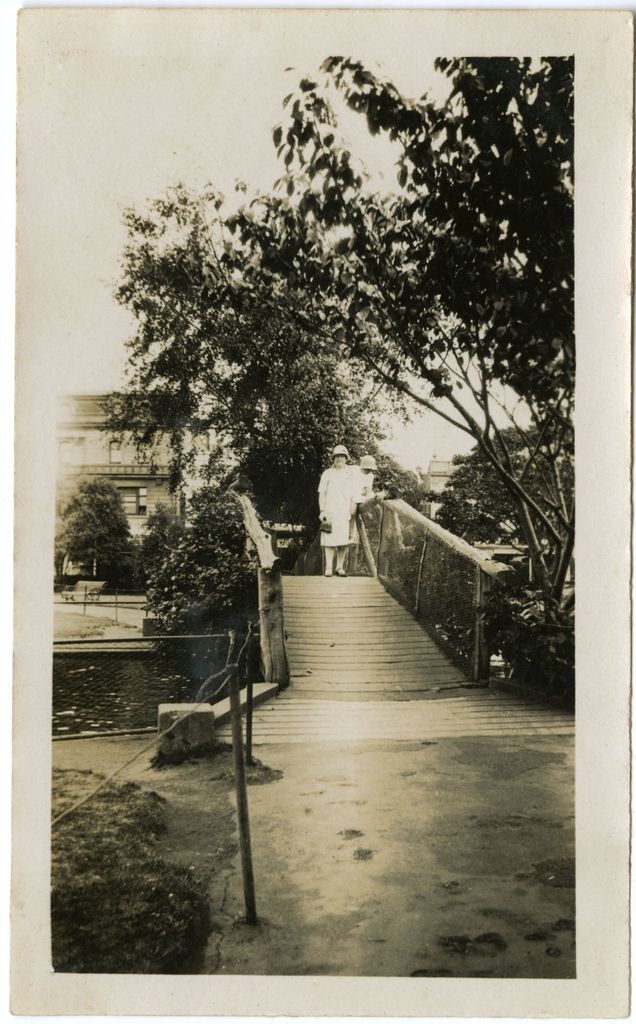 This photograph came from a small photograph album that belonged to Mrs R Andrews of Rangitikei House. This photograph bears the caption, "Bridge Over Duck Pond, Square PN Feb 28." The Duck Pond is now known as The Laklet or Butterfly Lake. The two figures on the bridge are Mrs May and Joyce from 2014P_AndrewsS1_010045. The Grand Hotel is visible on the left.