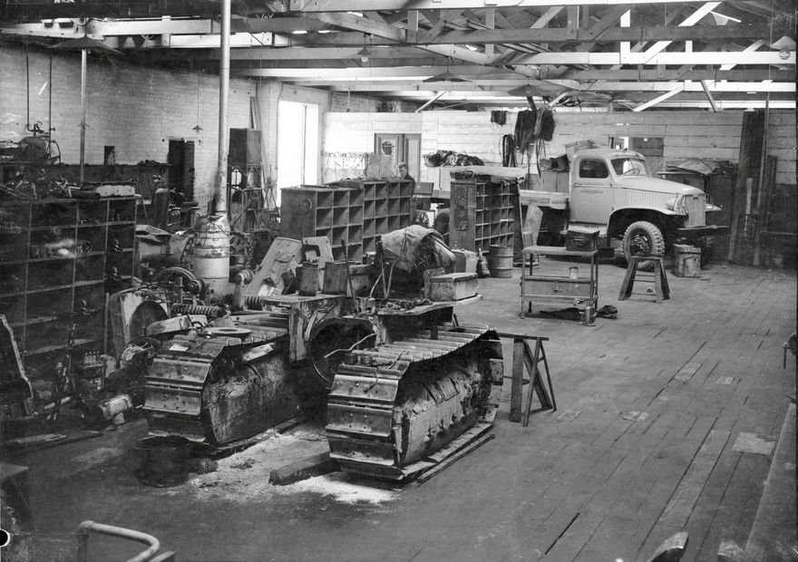 This appears to be the interior of Gough Gough and Hamer’s workshop. A partially dismantled caterpillar tractor can be seen. Their premises were located at 175 Rangitikei Street.