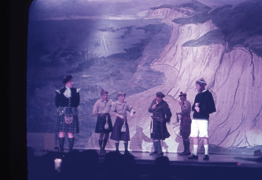 This image depicts senior scouts dressed in Highland battle dress perform a skit at the Gang Show 1963. The white cliffs of Dover are painted on the backdrop.