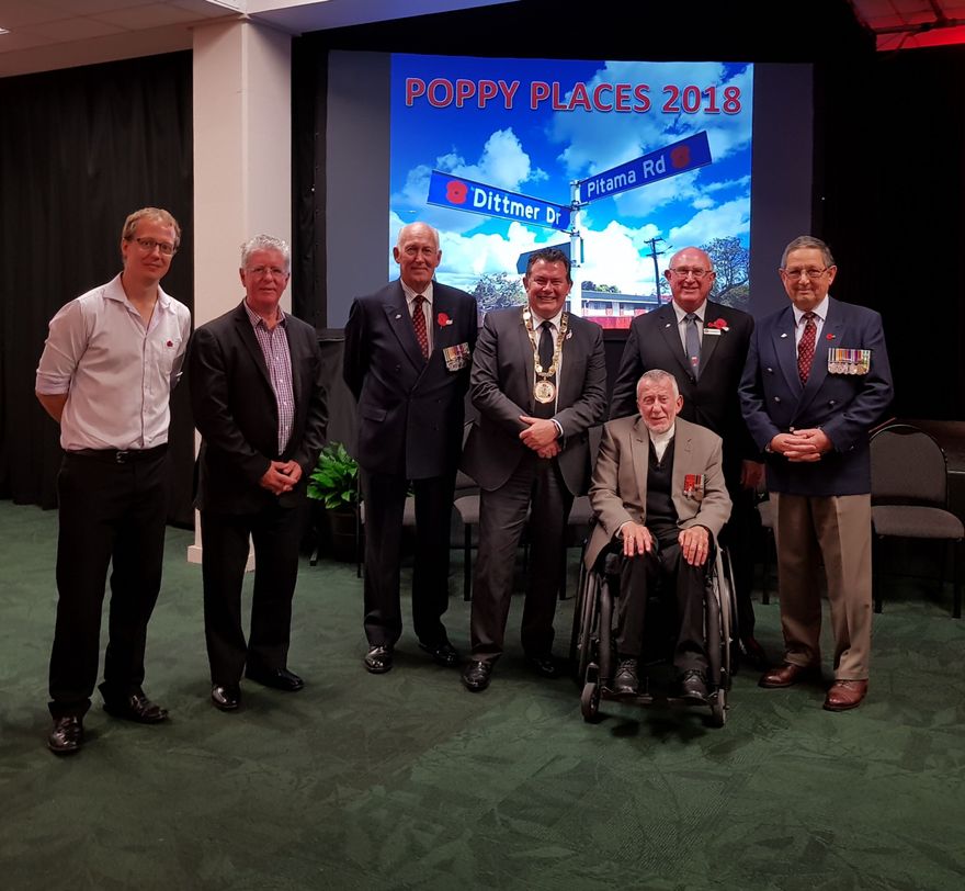 Photograph of individuals involved in the Poppy Places initiative for Palmerston North. The launch of the 2018 round was held at the Convention Centre on 11 November 2018 following the Armistice Day commemorations in The Square. From left to right: Evan Greensides (research article writer), Stephen Parsons, Terry McBeth (Poppy Places Trust), Mayor Grant Smith, Phillip Blundell MNZM (Poppy Places Trust), Joe Hollander and Joseph Bolton (Poppy Places Trust). Poppy Places website.