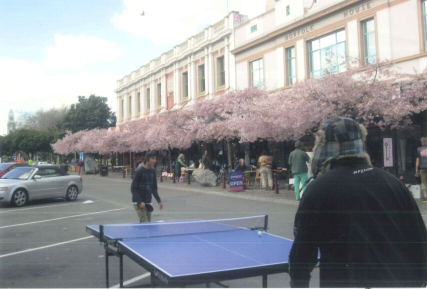 Teen's playing table tennis outside in the spring at the Youth Space.