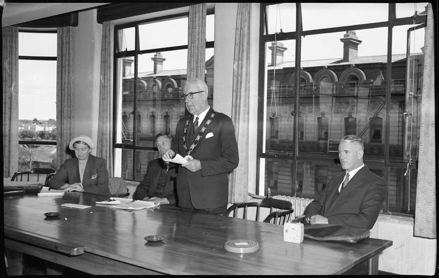 This image was taken for a story that ran in The Manawatu Evening Standard on 09 December 1958: "The Mayor of Palmerston North (Mr. W.B. Tennent, M.P.) opened the Royal Astronomical Society Conference on Saturday. Mr. Tennent is seen speaking to the members."