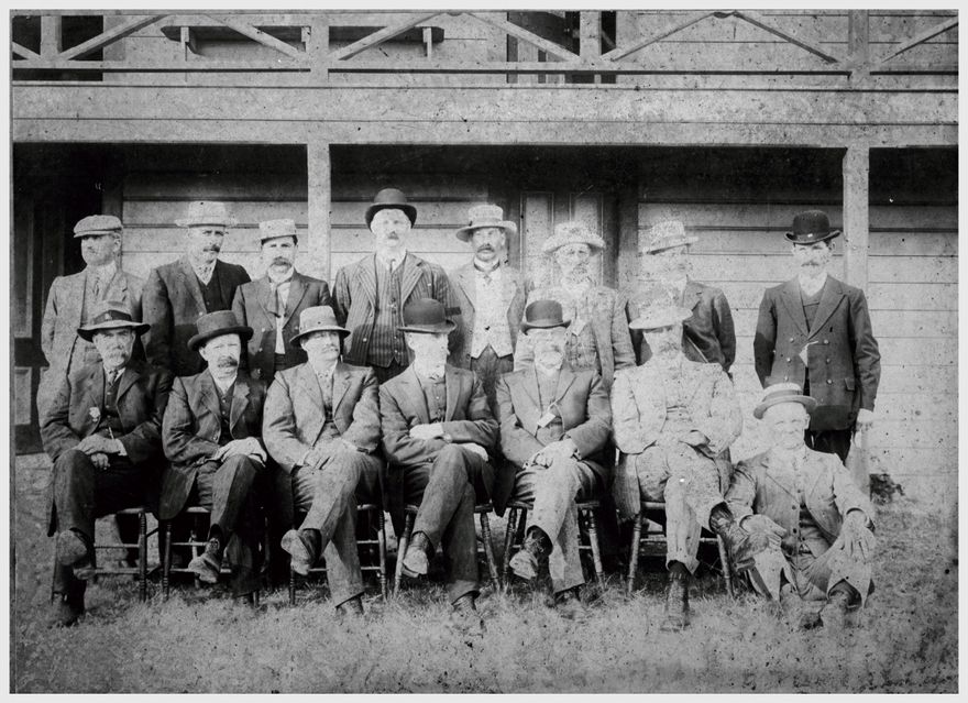 The Manawatu Racing Club was established on land whose use was granted by its Maori owners, and races were held from 1855 onwards. The acquisition of the Awahou Block by the Crown and the prospect of the sale of the land caused fear of loss of the course, and in 1865 a petition signed by local Pakeha and Maori was presented to the Provincial Council asking that the land be appropriated. Back Row from left : Unknown; Hynes; Dr Mandel; Howan; Nye; unknown x 3. Front row from left: Coley; Gray; Robinson; Unknown x 2; Symons; Unknown