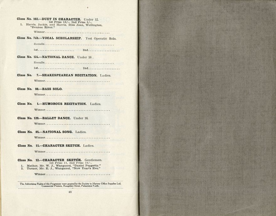 This is the programme for the Fifth Annual Festival of the Manawatū Competitions Society, which was held in the Opera House and Municipal Hall between 20 May and 28 May 1926. The competition categories included elocution (speech and drama), dance and music (both vocal and instrumental). Most entrants were children or young people. In addition to listing the events and names of competitors, the programme includes many advertisements for local businesses.