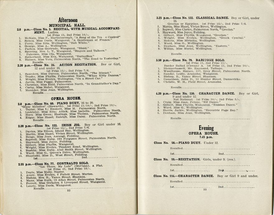 This is the programme for the Fifth Annual Festival of the Manawatū Competitions Society, which was held in the Opera House and Municipal Hall between 20 May and 28 May 1926. The competition categories included elocution (speech and drama), dance and music (both vocal and instrumental). Most entrants were children or young people. In addition to listing the events and names of competitors, the programme includes many advertisements for local businesses.