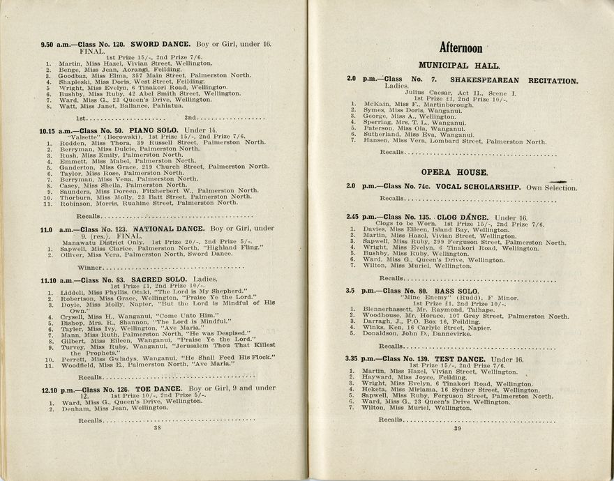 - This is the programme for the Fifth Annual Festival of the Manawatū Competitions Society, which was held in the Opera House and Municipal Hall between 20 May and 28 May 1926. The competition categories included elocution (speech and drama), dance and music (both vocal and instrumental). Most entrants were children or young people. In addition to listing the events and names of competitors, the programme includes many advertisements for local businesses.