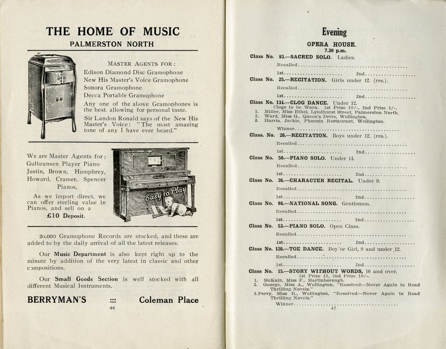 This is the programme for the Fifth Annual Festival of the Manawatū Competitions Society, which was held in the Opera House and Municipal Hall between 20 May and 28 May 1926. The competition categories included elocution (speech and drama), dance and music (both vocal and instrumental). Most entrants were children or young people. In addition to listing the events and names of competitors, the programme includes many advertisements for local businesses.