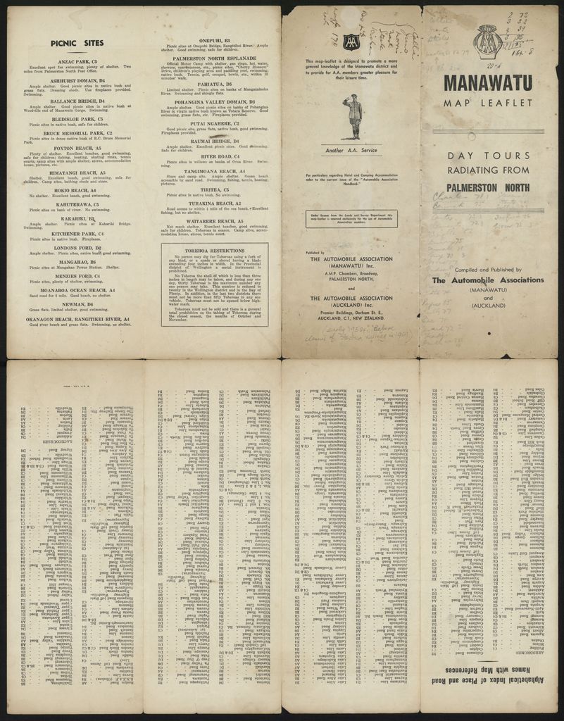 The cover of this map reads, "Manawatu Map Leaflet - Day Tours Radiating from Palmerston North. Compiled and Published by The Automobile Association (Manawatu) and (Auckland)."