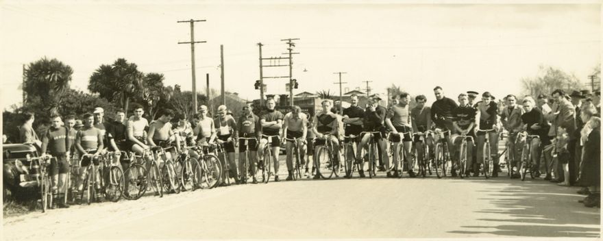 Competitors in a bike race lined up across the road. No details are known of the occasion.