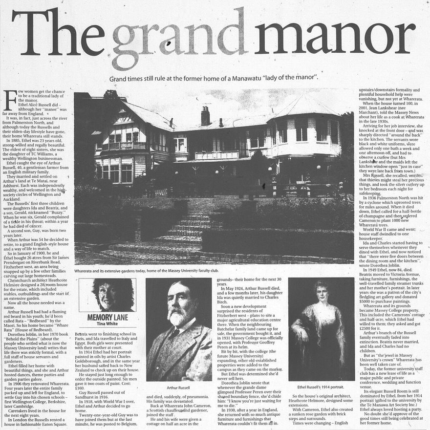 Journalist Tina White's weekly "Memory Lane" article in the Manawatū Standard. The story of historic home Whare Rata, later named Wharerata, and the Russell family who lived there in the early 20th century. The portrait of Arthur Russell mentioned in the article can be viewed here.