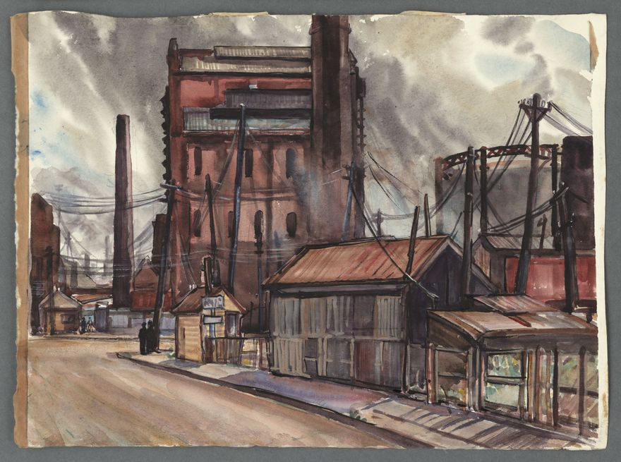 Painting of the Gas Works complex. Pen and wash. Colour. This gas works was built in Napier Road, Palmerston North, in 1922. John Tetley was a parasitologist at Massey Agricultural College and a well known amateur artist who exhibited locally.