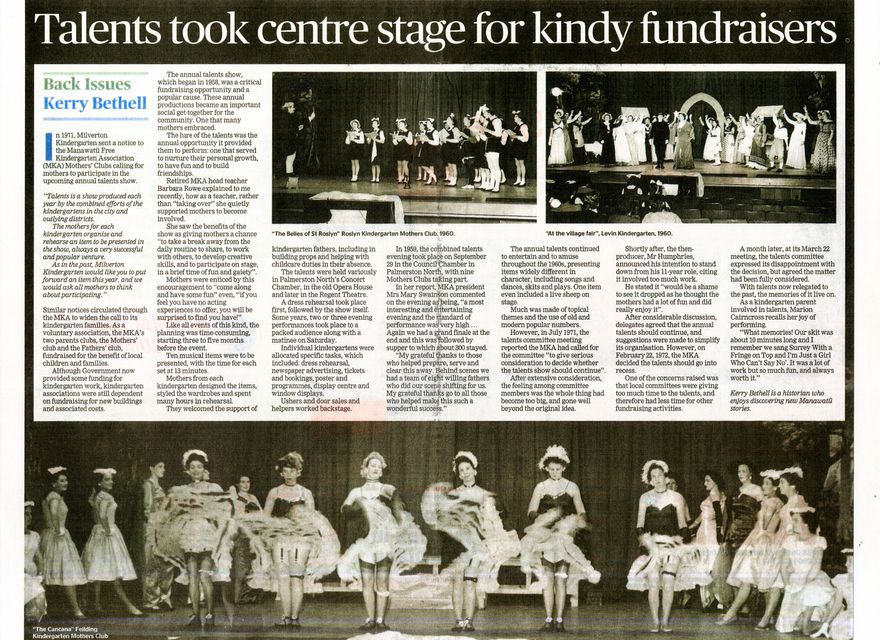 Local historians weekly "Back Issues" article in the Manawatū Standard. Fundraising talent shows were organised by kindergarten parents, 1958-1970s. Parents from different kindergartens organised and performed in the shows. These were held at the Palmerston North Concert Chamber, the Council Chambers, the old Opera House and later in the Regent Theatre.