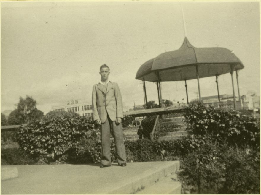 Mr Taylor stands on the steps of the war memorial with the band rotunda behind him.