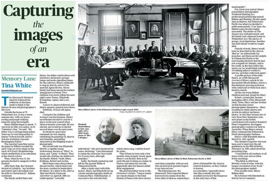 Journalist Tina White's weekly "Memory Lane" article in the Manawatū Standard. The life story of Palmerston North photographer and lay-preacher Henry Billens (1846-1936) and his family.