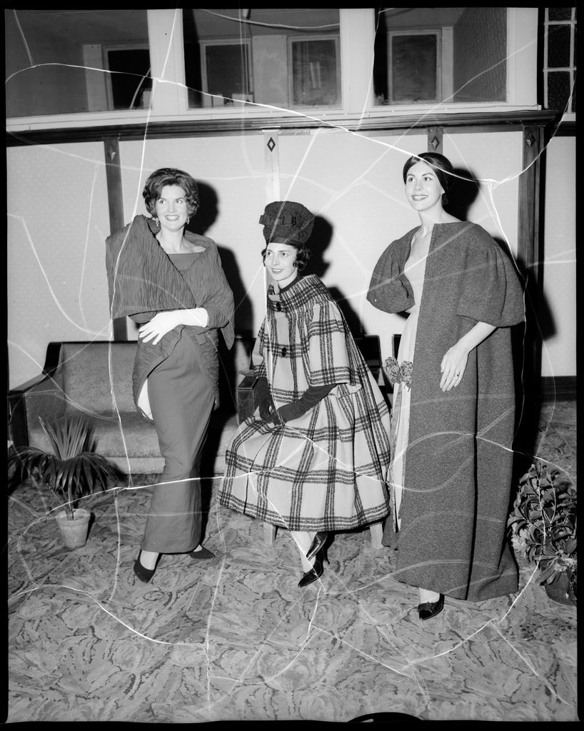 This image was taken for a story that ran in The Manawatu Evening Standard on 21 July 1961 "Three gold medal award winning models, showing the high fashion, elegant, and versatile qualities of wool fibre, seen at the social event concluding the recent Massey College Wool Association conference, by the Wool Board. On the left is Judy in a vibrant red evening coat of hand-ruched wool covering a slim sheath woolen gown with a graceful train ; Sue (centre) wears the striking greatcoat of mushroom wool with big black overhooks, completely water repellent, cut with extra fullness, pleated onto the yoke and deep wide sleeves. The only seam is under the sleeves. Diane's ankle length gown is in a pale lilac with the box-pleated skirt trimmed with bunches of violets and matching ribbon. The strapless top is accented by sleeve bands of velvet and violets. Over it she is wearing this dramatic evening coat in deep vibrant purple fully lined with satin."