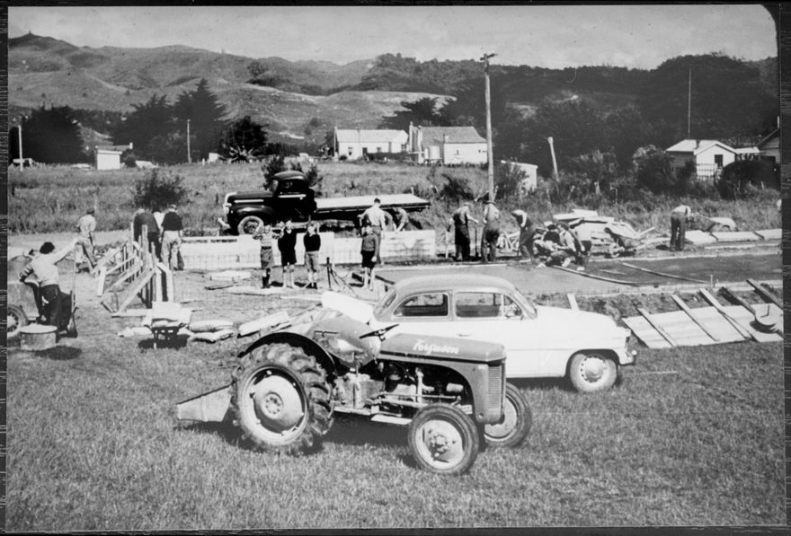 A group working on the construction of the Ashhurst School Pool, which was officially opened in February 1958. The pool was built with voluntary labour. The tractor in the foreground is a Massey Ferguson, probably a Ferguson TO-30 or TO-35.