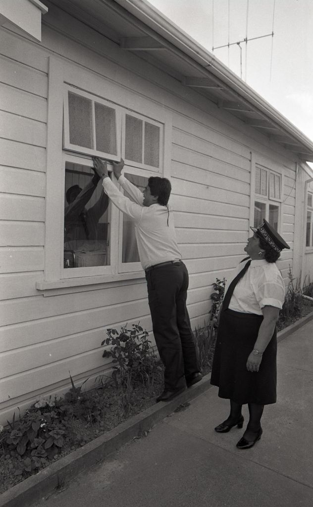 This image accompanied a feature ran in the Manawatu Evening Standard on January 17 1987 about the work of Māori Wardens in Marton. According to the story that accompanied the photographs, Māori Wardens were instituted in 1937 and by 1987 there were 2300 working voluntarily throughout in New Zealand under the jurisdiction of the Māori Wardens' Association. Before receiving their badges and warrants, trainee wardens underwent an 18 month probationary period, taking training from senior wardens and the district wardens' associations.