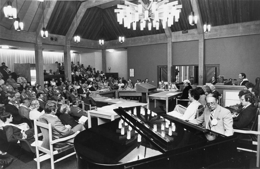 The first meeting in the new Council Chamber for Palmerston North was presided over by the Mayor, Brian Elwood. Palmerston North jazz pianist, Ron Glen, played a selection of jazz items at the end of the formal opening of the new Council Chamber, on 20 December 1979. The bulding was dedicated by Mr David Brown, President of the Palmerston North Minister's Association.