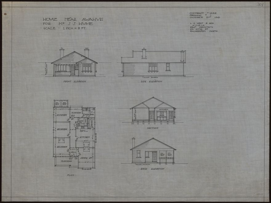 This plan for a three bedroom villa with front verandah was designed by L. G. West and Son for J. J. Hume. The Danish-born architect Ludolph Georg West (1846-1919) established an architectural practice in Palmerston North in about 1880. In 1912 he formed a partnership with his son, Ernest Vilhem West, who continued the business after his father's death.