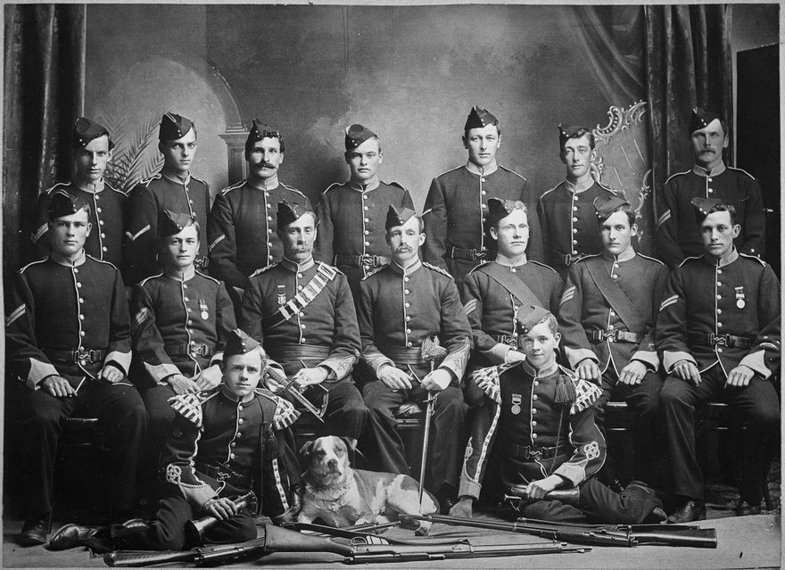 Sixteen members of the Palmerston North Rifles with a dog. The Palmerston North Mounted Rifles were formed in 1891.