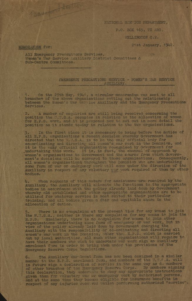 Memorandum from National Service Department 21 January 1942