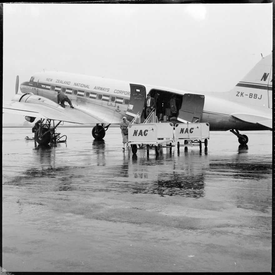 This image was taken for a story that ran in the Manawatu Evening Standard on 18 April 1963, "Airline travellers were met with a dismal welcome on their arrival at Palmerston North yesterday. With steady rain and a cool wind, the city airport presented a gloomy picture. Travellers wasted no time in getting from the aircraft to the terminal buildings."