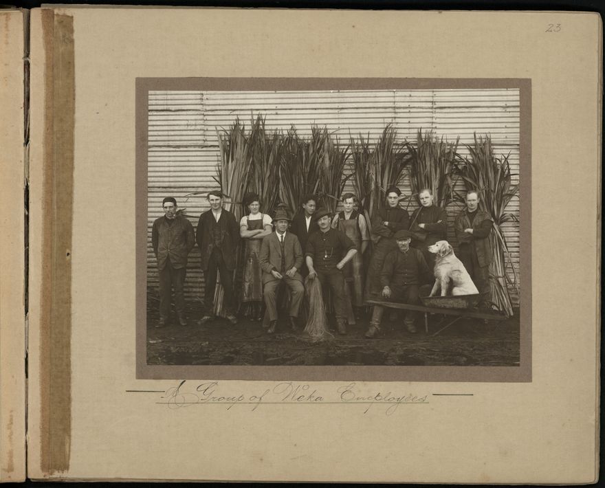 This photograph album contains photographs of the Seifert flaxmills Weka and Miranui. Flax workers are pictured cultivating, gathering, drying and processing the fibres. Details of the transport operations undertaken by cart and barge are also shown.