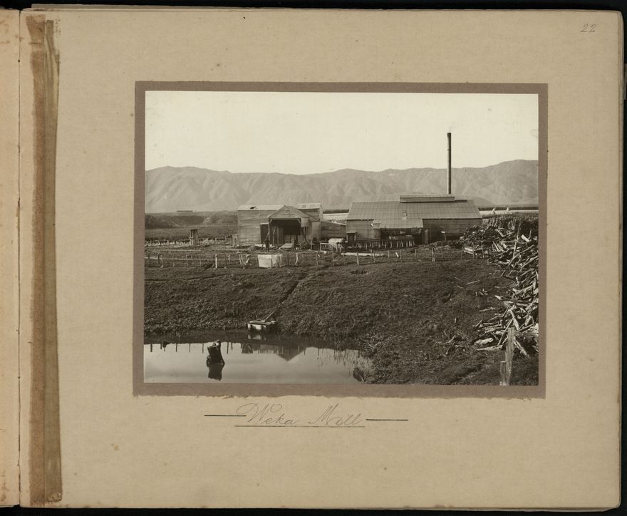 This photograph album contains photographs of the Seifert flaxmills Weka and Miranui. Flax workers are pictured cultivating, gathering, drying and processing the fibres. Details of the transport operations undertaken by cart and barge are also shown.
