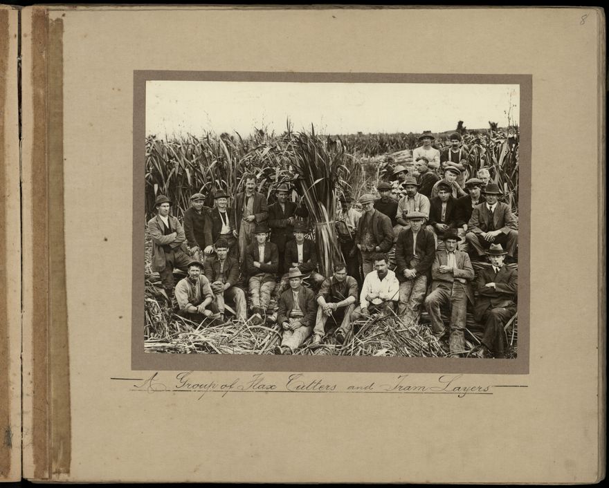 This photograph album contains photographs of the Seifert flaxmills Weka and Miranui. Flax workers are pictured cultivating, gathering, drying and processing the fibres. Details of the transport operations undertaken by cart and barge are also shown.
