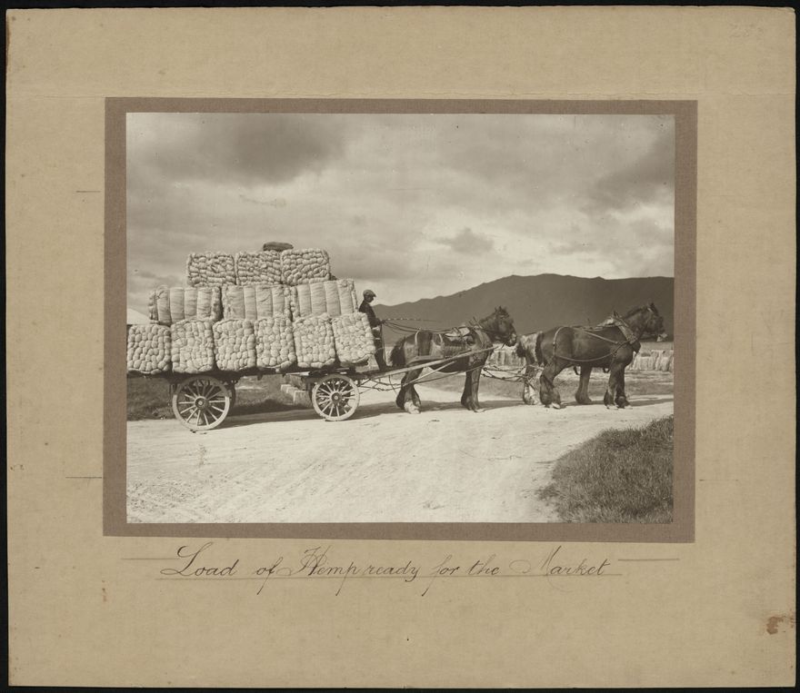 This photograph album contains photographs of the Seifert flaxmills Weka and Miranui. Flax workers are pictured cultivating, gathering, drying and processing the fibres. Details of the transport operations undertaken by cart and barge are also shown.
