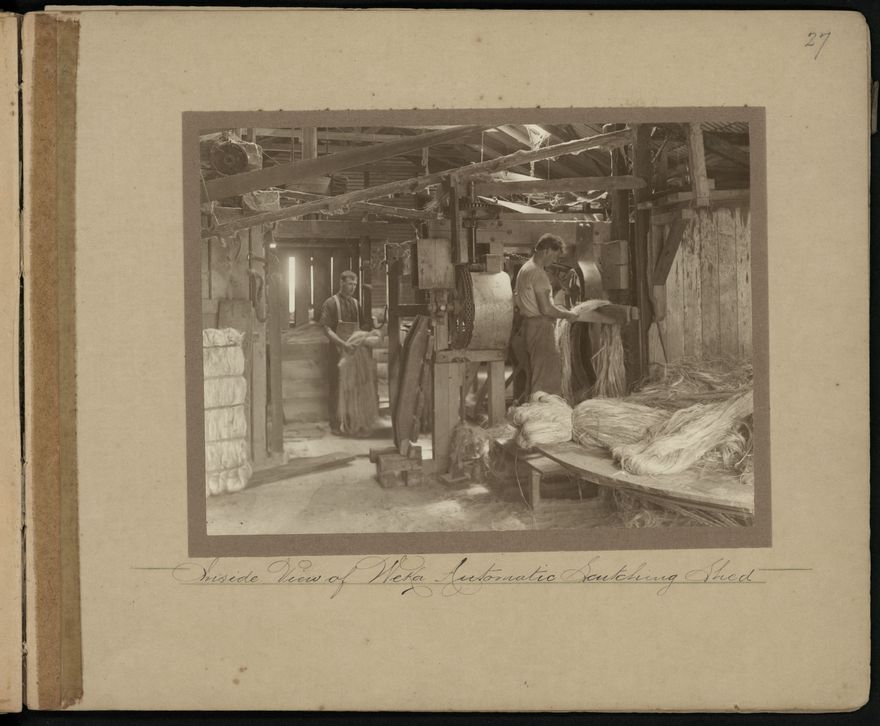 This photograph album contains photographs of the Seifert flaxmills Weka and Miranui. Flax workers are pictured cultivating, gathering, drying and processing the fibres. Details of the transport operations undertaken by cart and barge are also shown.