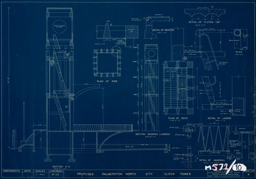 Detailed plan of the deck and internal ladders of the Palmerston North Clock Tower. The clock in the Clock Tower, named Kerei Te Panau after a local Rangitāne chieftain, was originally housed in the Chief Post Office. Due to safety concerns both the tower and clock were removed from the Post Office after the 1942 Wairarapa earthquake, and the clock placed in storage. In 1953 Arthur Hopwood gifted the city of Palmerston North £10,000 to build a new tower in The Square to hold the clock and chimes. It was completed in 1957.