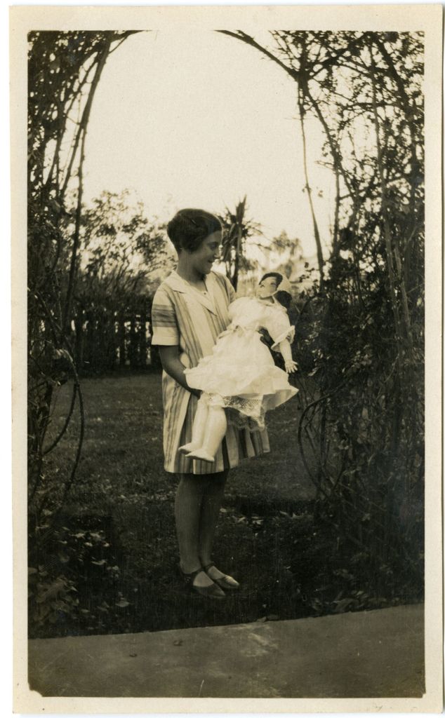 This photograph came from a small photograph album that belonged to Mrs R Andrews of Rangitikei House. This photograph bears the caption, "Marjorie and her Doll 8th May 1928 PN".