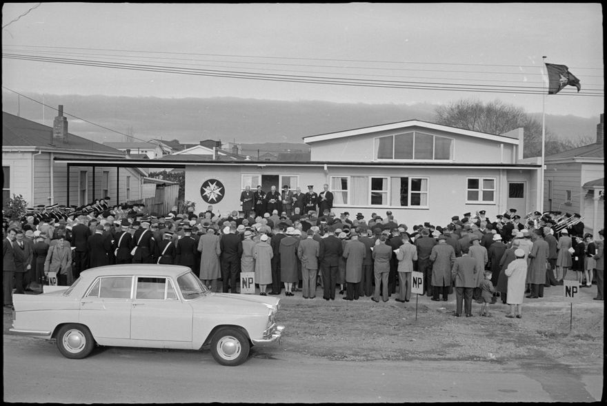 Caption: “An overall view at the opening showing the clean lines of the modern building.” The new St. John Ambulance Association Hall is still situated in Cuba Street (in 2025).
