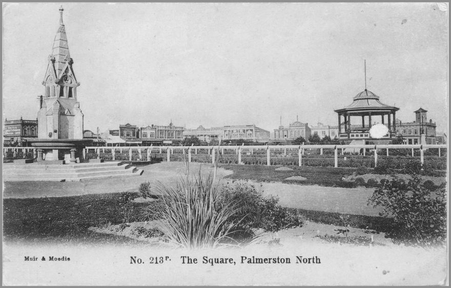 The statue on the left of the photograph is part of the commemoration of Edward VII, built in August 1902. The top of it is now part of the fountain that once graced the area in front of the old DIC building (now the City Library). The fountain now lives in the portion of the Square closest to Broadway Avenue, near the Ladies' Rest.