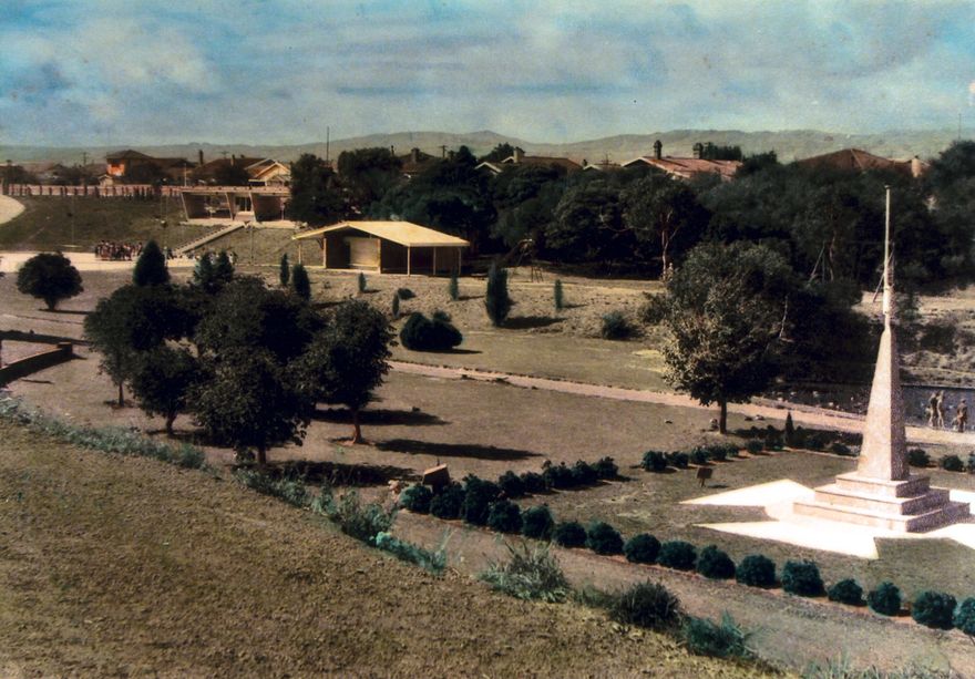 Colour enhanced print of Memorial Park, looking down from Napier Road side. The War Memorial at right, was dedicated to those who died in World War I and World War II, was opened in 1952 at what was then called Fitzroy Park. It was renamed Memorial Park in 1954.