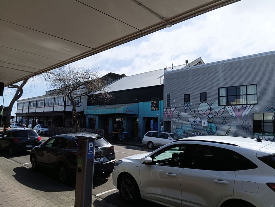 Photo shows several buildings that have developed and/or been preserved along George Street and the former government reserve land that included part of Cuba Street and Coleman Place.